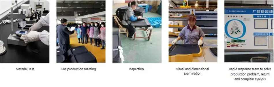 Plne spĺňame normy ISO9001 pre dizajn a výrobu autokobercov, ISO/TSI16949 pre kontrolu kvality, ISO14001:2015 pre environmentálne manažérstvo, BSCI pre sociálnu zodpovednosť a normy EÚ REACH pre suroviny. Máme interné testovacie zariadenia na vykonávanie vlastných kontrol, aby sme zabezpečili, že naše produkty prejdú testami vykonanými spoločnosťami SGS, Intertek alebo akýmkoľvek iným inšpektorom tretej strany, ktorý klienti môžu požadovať.