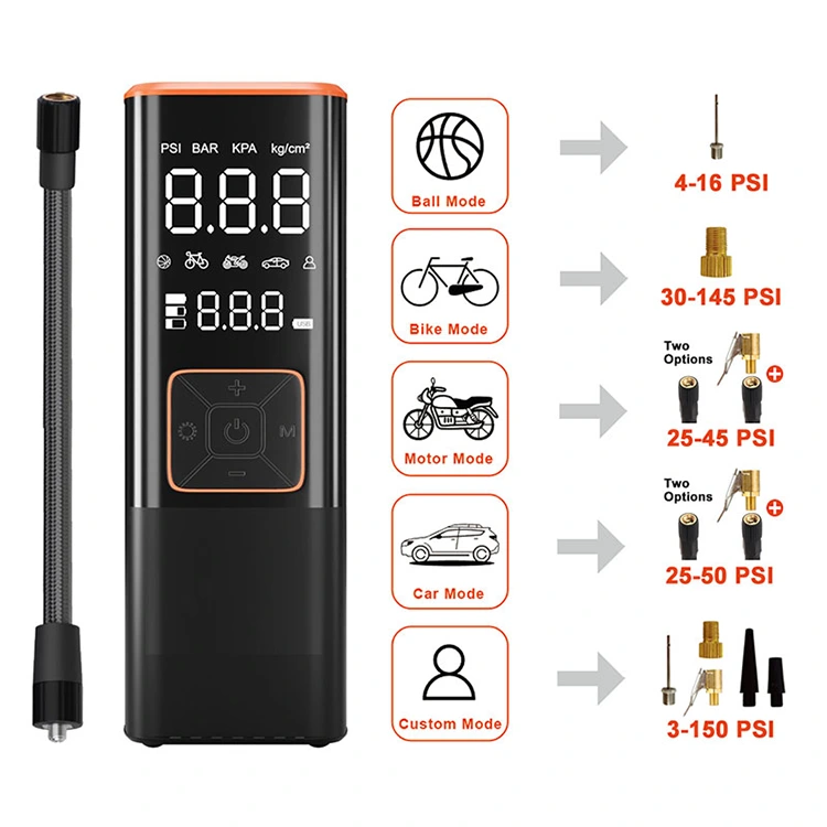Jednotky tlaku: PSI, KPA, BAR, KG/CM² a štyri prednastavené režimy hustenia. Môžete nastaviť tlak štyroch prednastavených režimov podľa vášho vozidla. Toto vzduchové čerpadlo je vhodné pre: