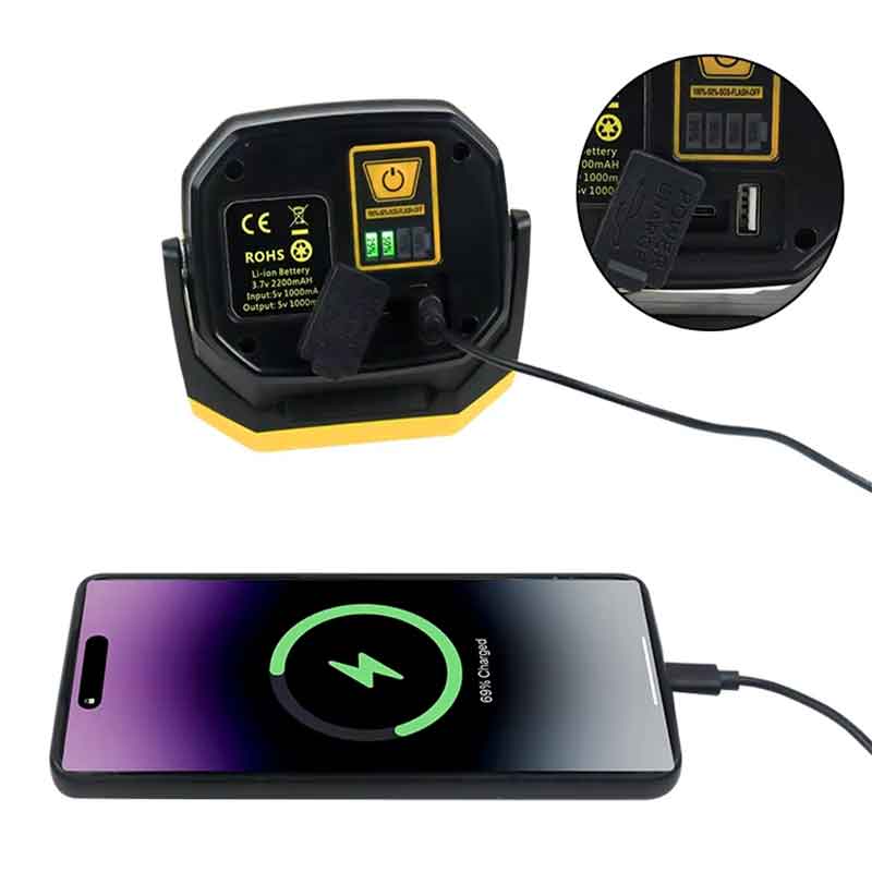 A: Áno. Port USB-C podporuje vstup (nabíjanie pracovného svetla) aj výstup (funguje ako power banka na nabíjanie mobilných zariadení).